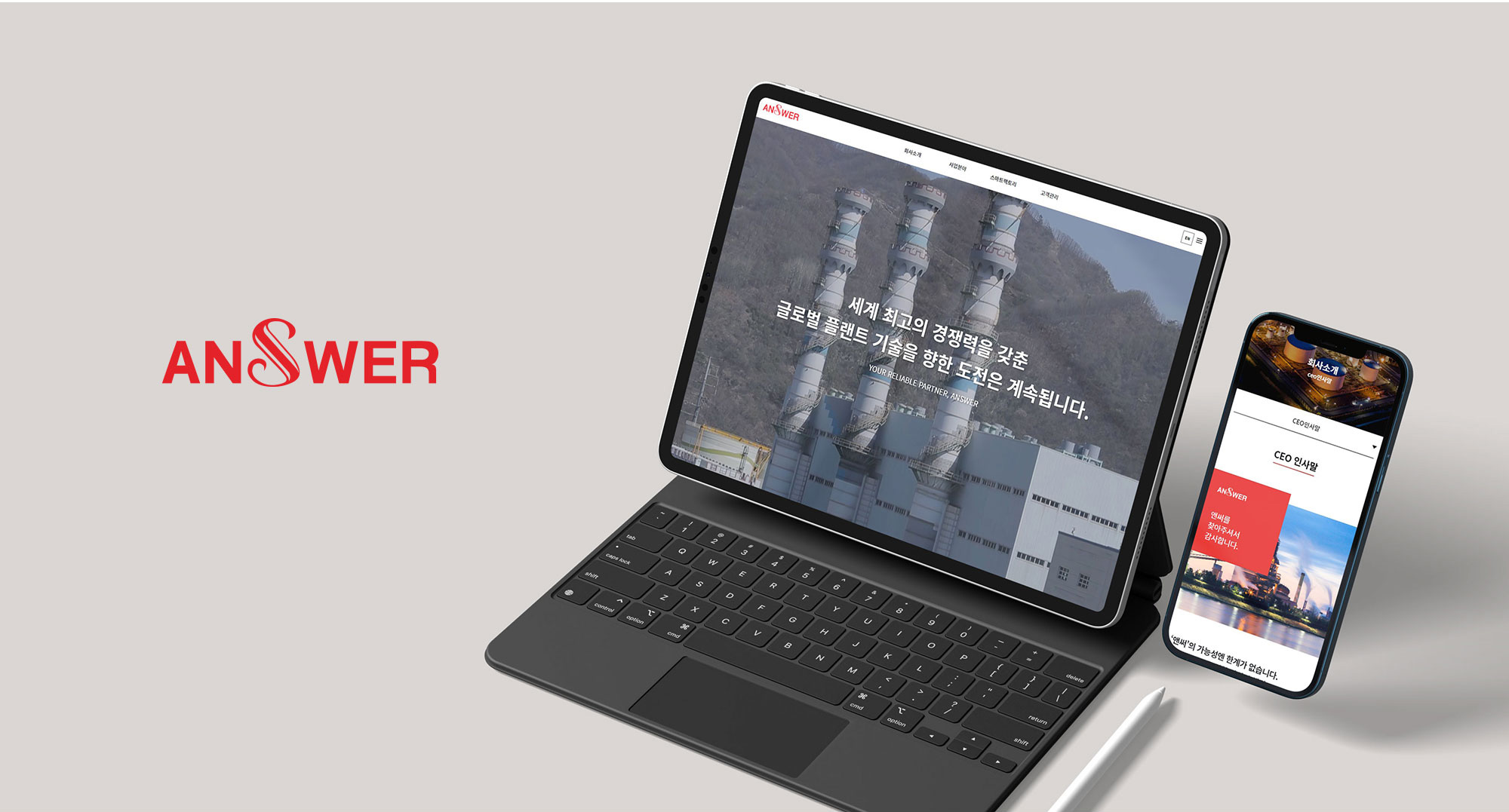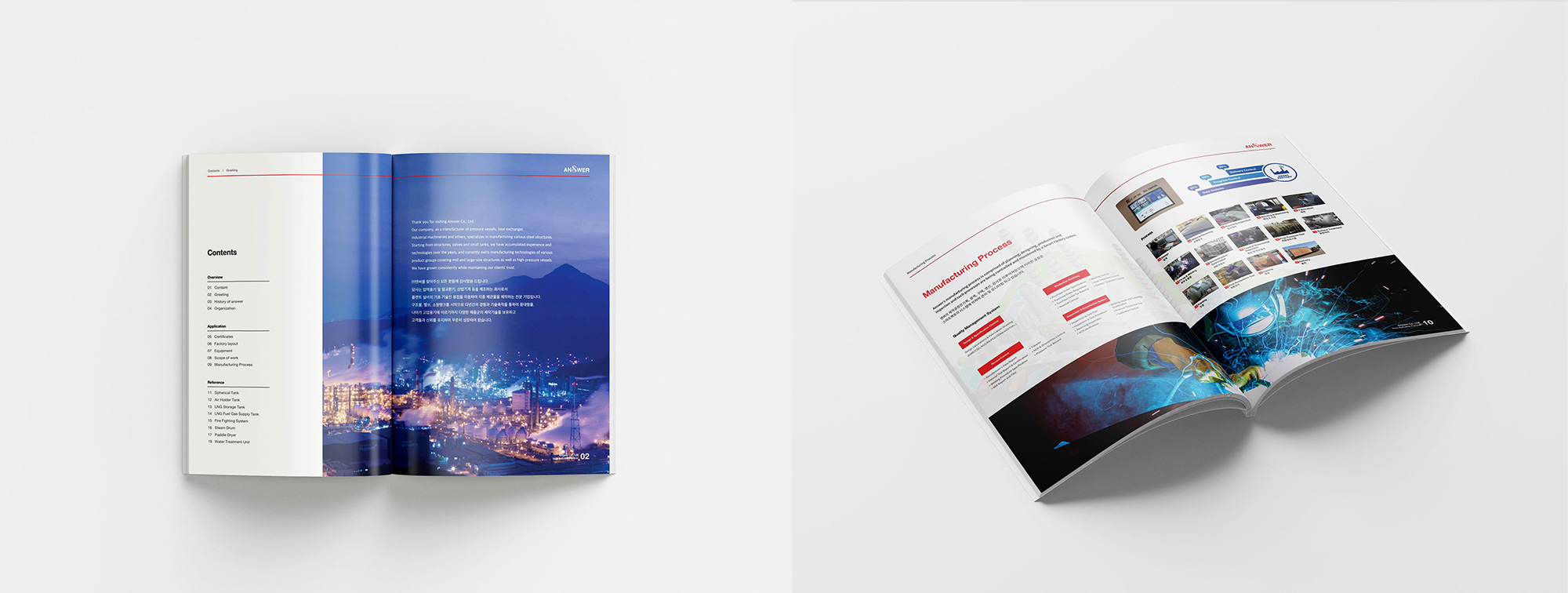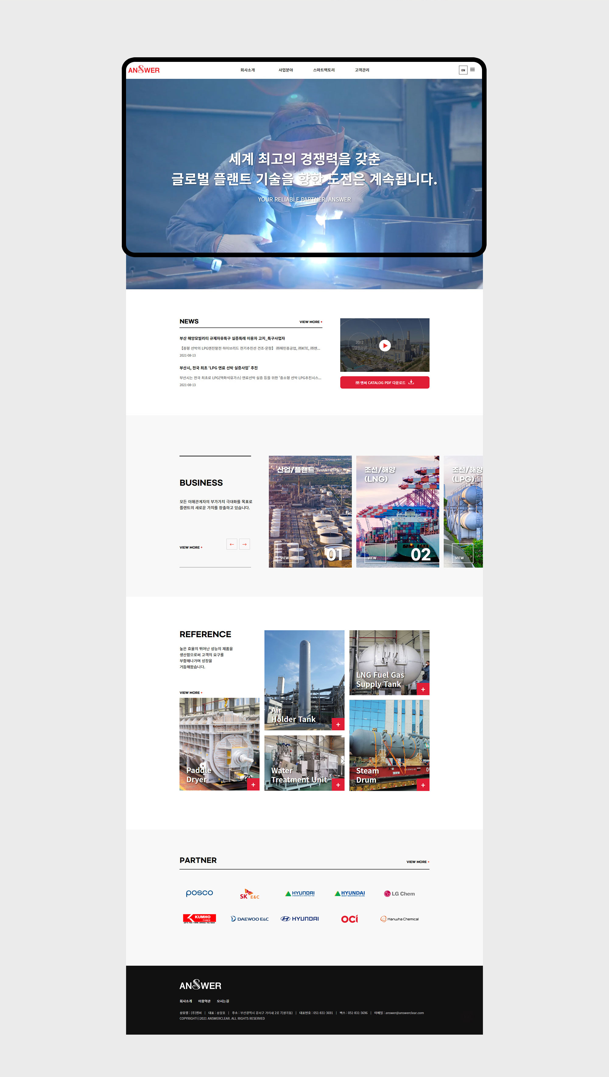 앤써는 플랜트 설비의 기술인 용접을 이용하여 다양한 제관물을 제작하는 기업입니다. 국문 및 영문 페이지로 구성된 홈페이지와 홍보물 카탈로그를 제작하는 프로젝트를 진행하여 디자인부터 퍼블리싱까지 웹표준& 접근성을 고려하여 100% 참여하였으며 또한 자체제작 어드민 페이지를 디자인하여 게시판을 구현하였고 Jquery를 이용한 유튜브 영상 모달창과 Swiper, top 버튼 등 여러 효과를 구현하였습니다. 클라이언트와의 원활한 소통을 통해 유지보수하며 완성도 높은 사이트를 구현하였습니다. 홍보용 카탈로그에는 이미지를 효과적으로 활용하여 컨텐츠의 이해를 돕는 기획과 디자인을 진행했습니다.