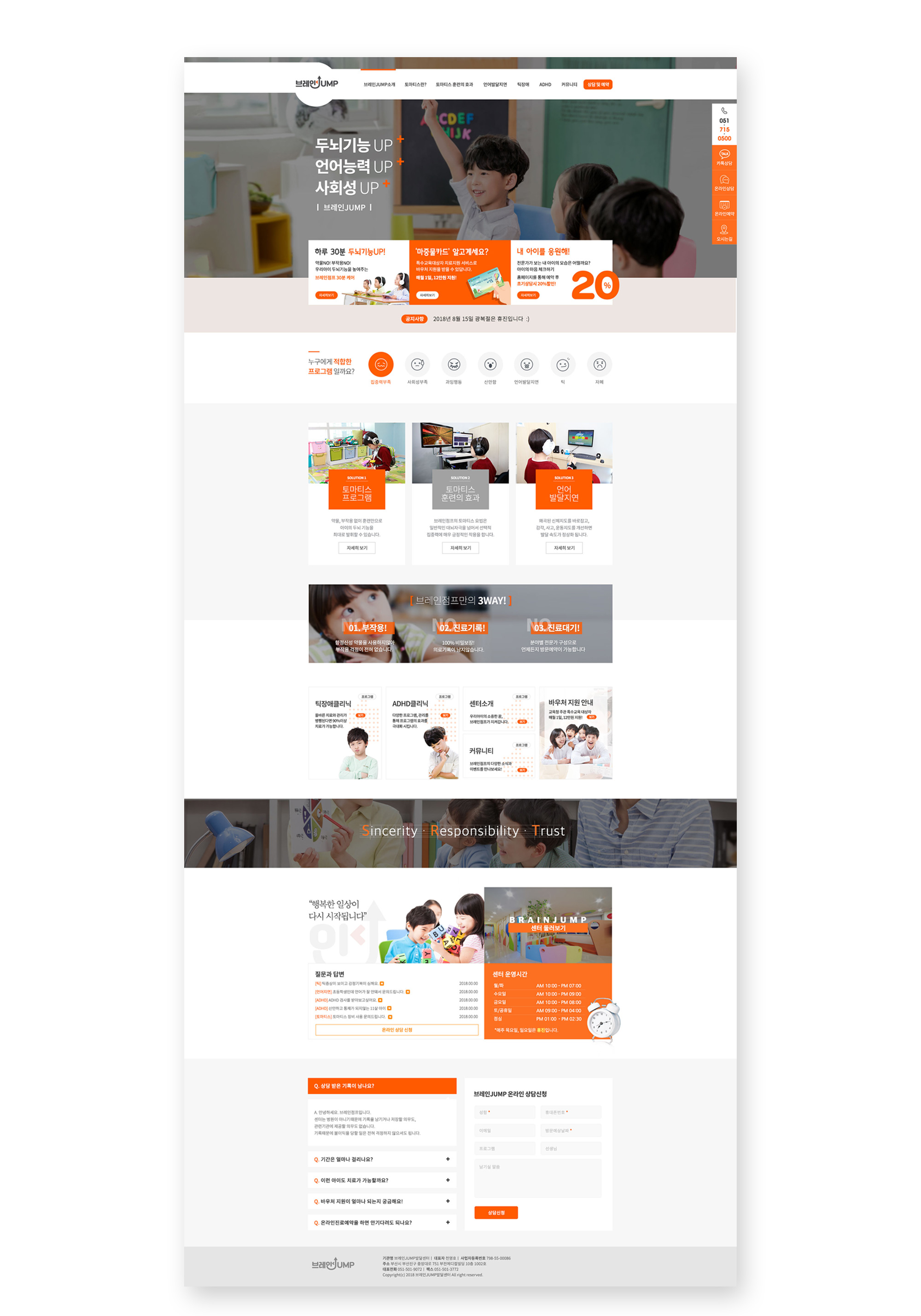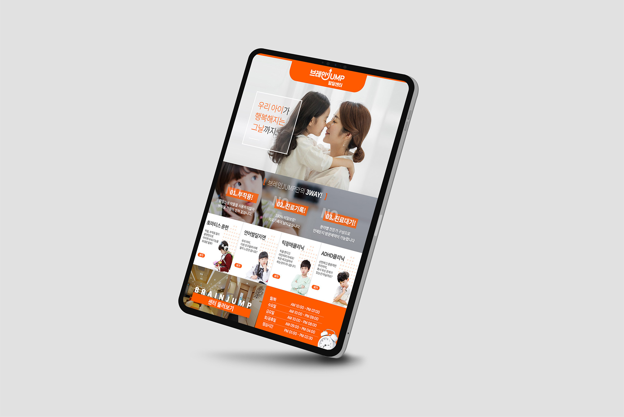 브레인 점프는 아이들 발달 센터를 위한 브랜드로서, 긍정적인 에너지를 상징하는 오렌지 컬러를 주요 브랜드 컬러로 선택했습니다. 로고부터 웹사이트, 인쇄물, 카페 스킨, SNS 콘텐츠까지 모든 디자인 작업을 진행했습니다. 깊이 있는 내용을 전달하기 위해 깔끔하고 명료한 레이아웃으로 구성했으며 퍼블리싱도 100% 참여하여 구현하였습니다. 또한 유지보수 작업까지 완료하여 원활한 운영이 가능하도록 하였습니다.