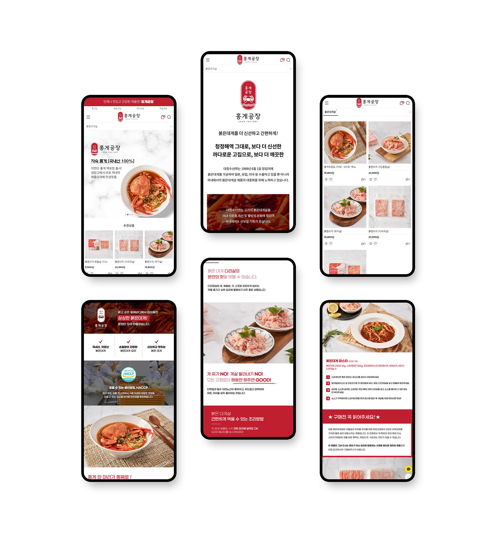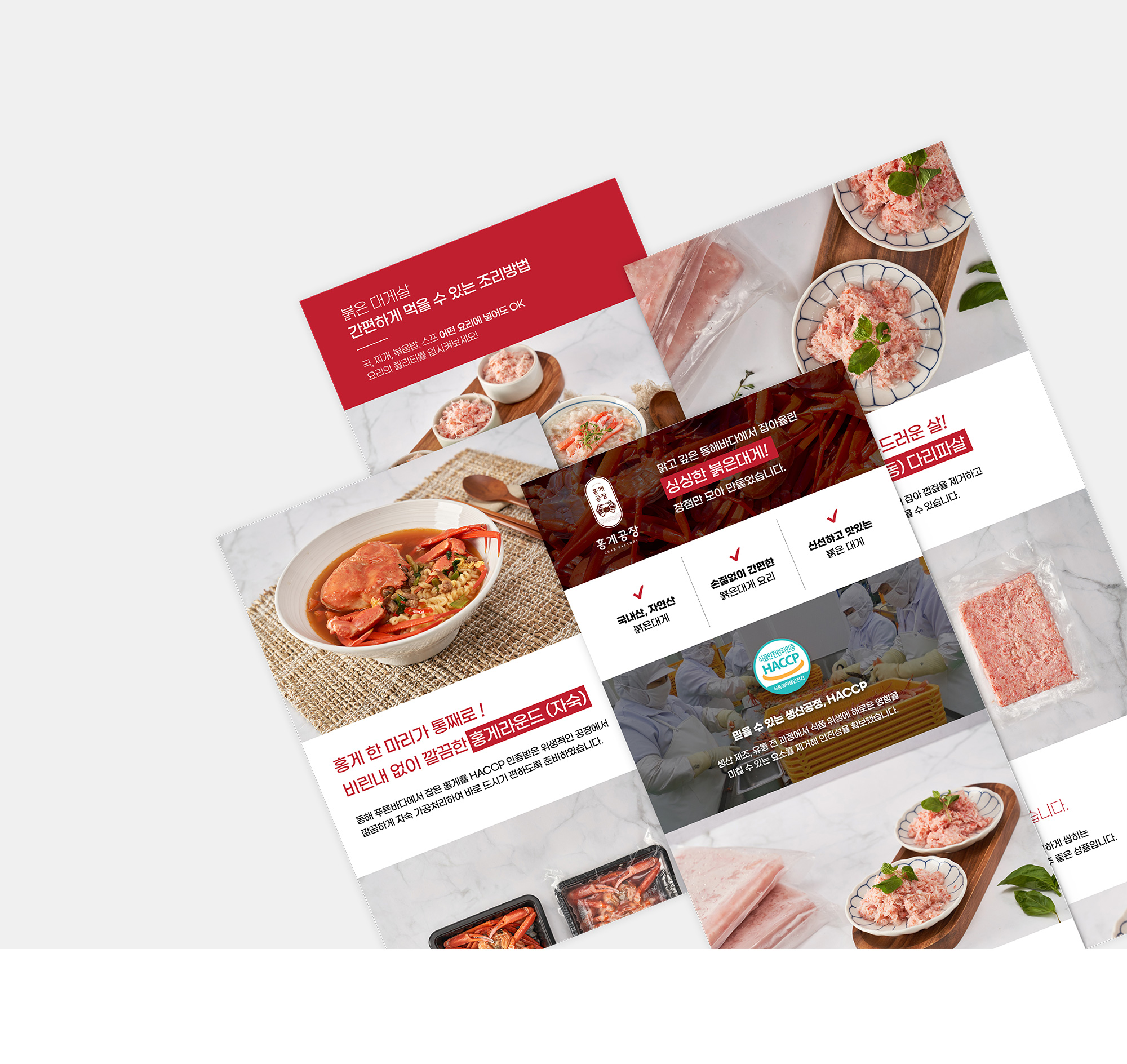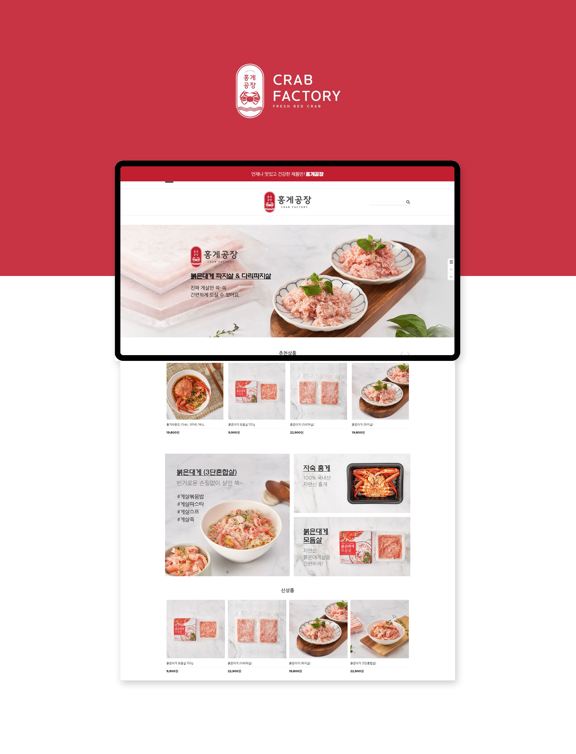 (주)대정수산 홍게공장 쇼핑몰은 붉은대게를 판매하는 업체로 브랜드 컬러인 레드를 이용하여 전체적으로 톤을 유지하여 메인페이지 및 상세페이지의 일관성을 부여하였습니다. 프로젝트 진행시 제품 컨셉 촬영부터 함께 진행하였으며 디자인, 퍼블리싱, 유지보수까지 100% 참여하여 완료하였습니다.