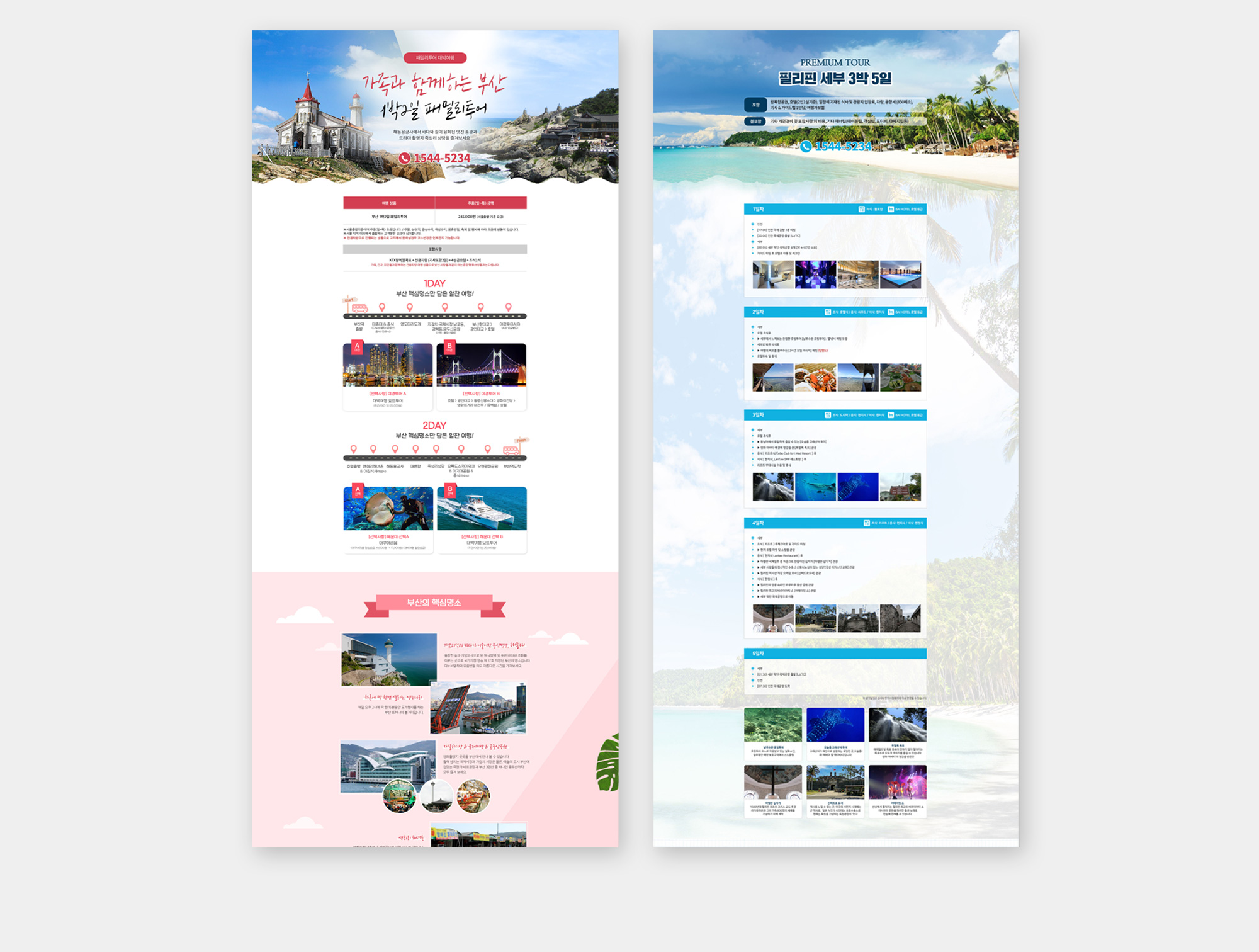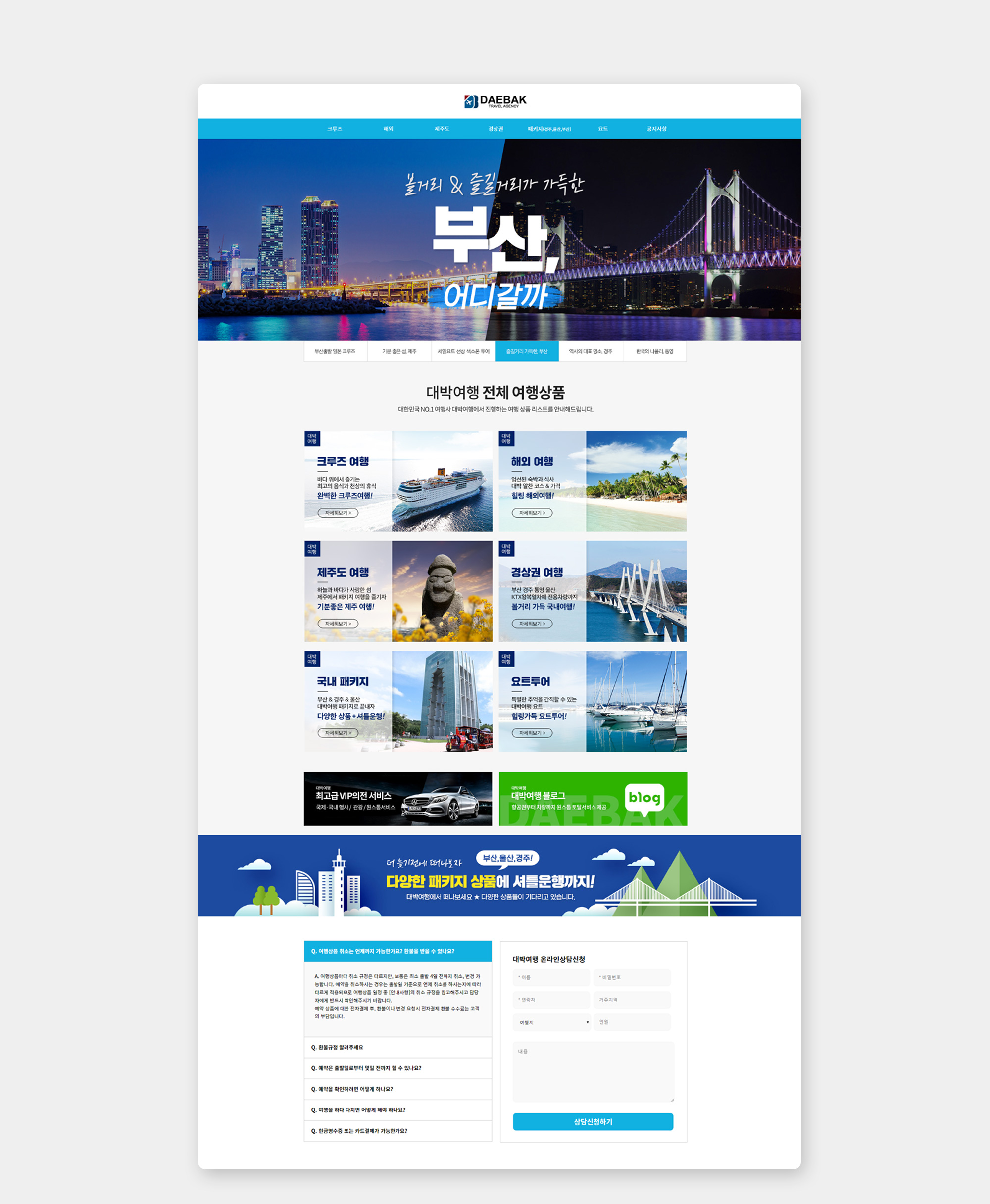 대박여행은 프라이빗 맞춤형 여행 상품을 제공하는 여행사로 주 타겟층인 중·장년층임을 고려하여 직관적이고 명료한 레이아웃으로 구성하였으며 디자인, 퍼블리싱 100% 참여하여 구현하였습니다. 또한 클라이언트의 요청사항을 반영하여 사이트 유지보수까지 진행하였습니다.